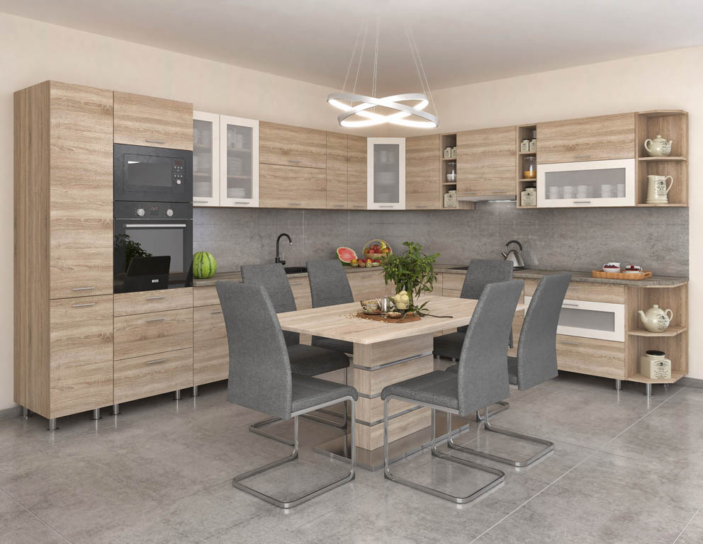 18 mm-es laminált faforgácslap, 0,4 mm-es ABS-el élzárva, süllyesztett fejű forgácslapcsavarral összeszerelve. A hátfal 3 mm-es fehér HDF lemez, tűzőkapoccsal rögzítve. A fiókok fehér kávával és teljes kihúzású fiókcsúszóval szereltek. A felső fiókhoz evőeszköztartót adunk. A polcok fém polctartókkal rögzítettek. A felnyíló ajtók gázteleszkópos felnyíló vasalattal szereltek. A fém lábak 10 cm-esek, állíthatóak és króm színűek. 28 mm-es, ABS-el élzárt, darabolt, elemenként rászerelt munkalappal, 2 mélytálas teletetős mosogatótálcával.