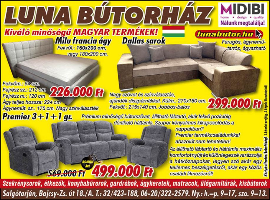 A LUNA BÚTORHÁZ Nógrád megye székhelyén található. 1997-ben Salgótarjánban nyitottuk meg üzletünket. Termékeinket a színek, formák stílusok széles választéka jellemzi. Üzleteinkben megtalálhatók nappali- és ifjúsági szekrénysorok, elemes bútorok, hálószoba bútorok, kárpitozott garnitúrák, konyhabútorok, étkezők, matracok, kiegészítő kisbútorok és irodabútorok.